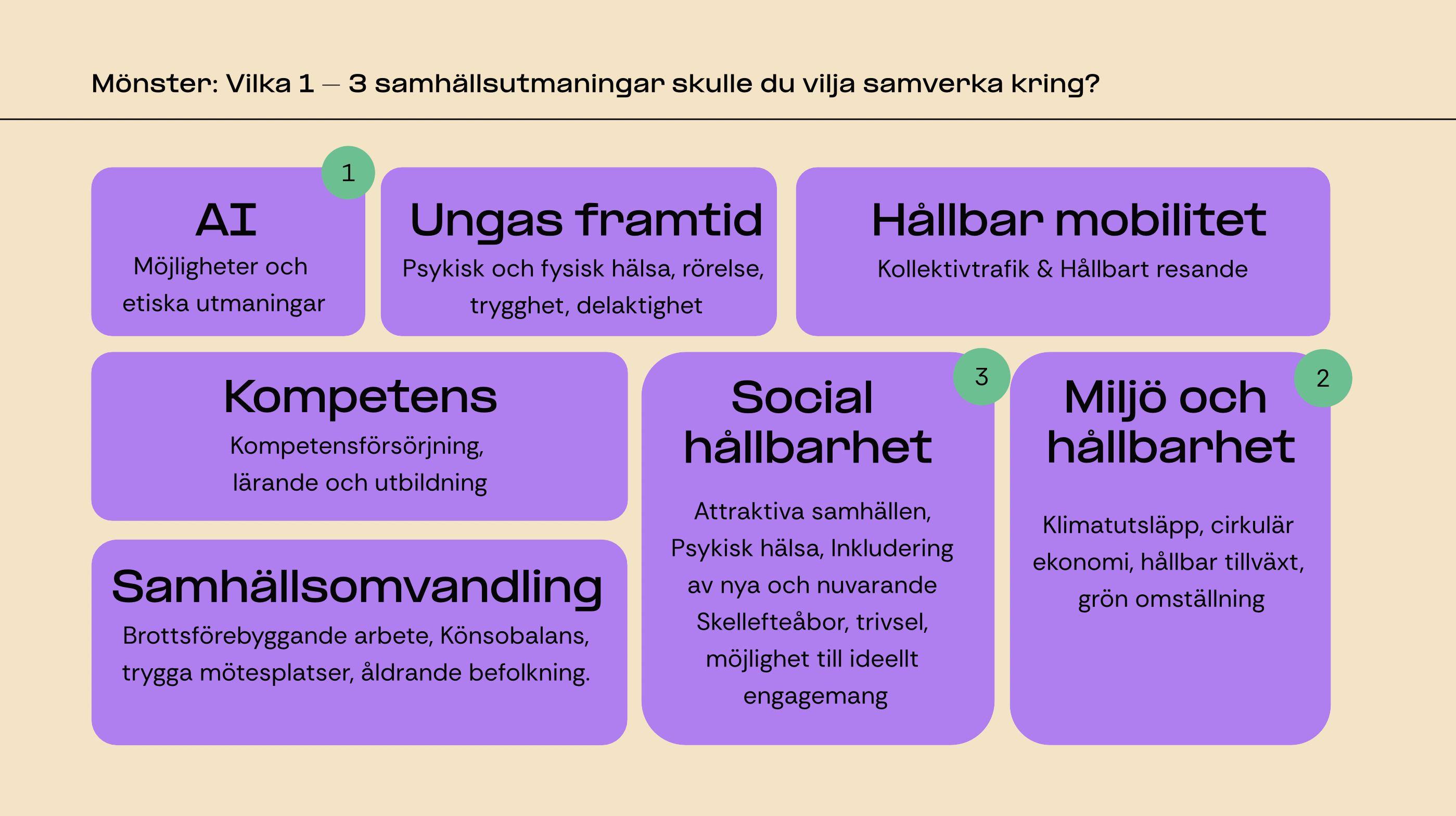 Här är en sammanställning av samhällsutmaningarna som deltagarna vill samverka kring: